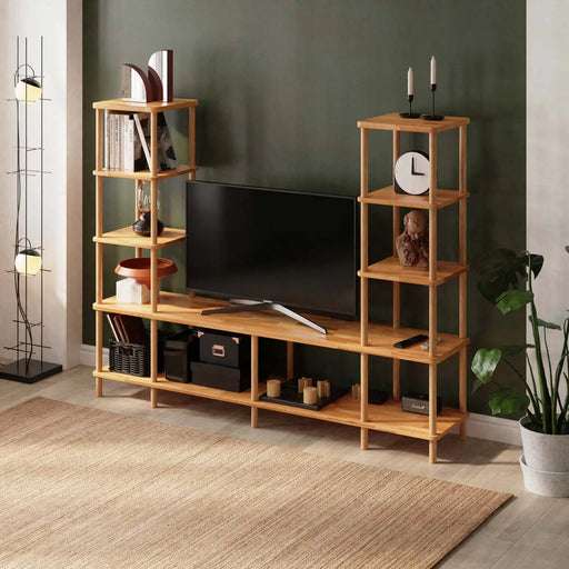 MozilyaArtemis Wood TV Stand. The Artemis Wood TV Stand is made of solid pine wood, offering two drawers, two cabinets, and two open cubbies for storage. ...