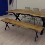 Blending an industrial style with a farmhouse, this live-edge bench features a natural soft top and metal legs. Place it next to your dining table to enjoy family dinners.
