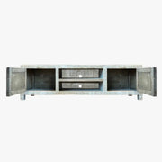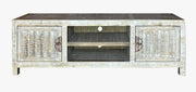 This rustic entertainment console will help streamline your living space. Its distressed wood finish has a subtle antique look that adds character to your home and allows you to save cabinet space for other items. The storage console can hold most televisions up to 85 inches.