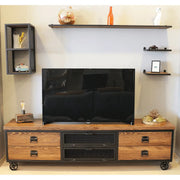 Produced with the integrity of natural wood material warmth and metal frame strength, this TV stand has a dynamic and sporty design with vintage details. You can organize your daily use items that you need in the drawer section.